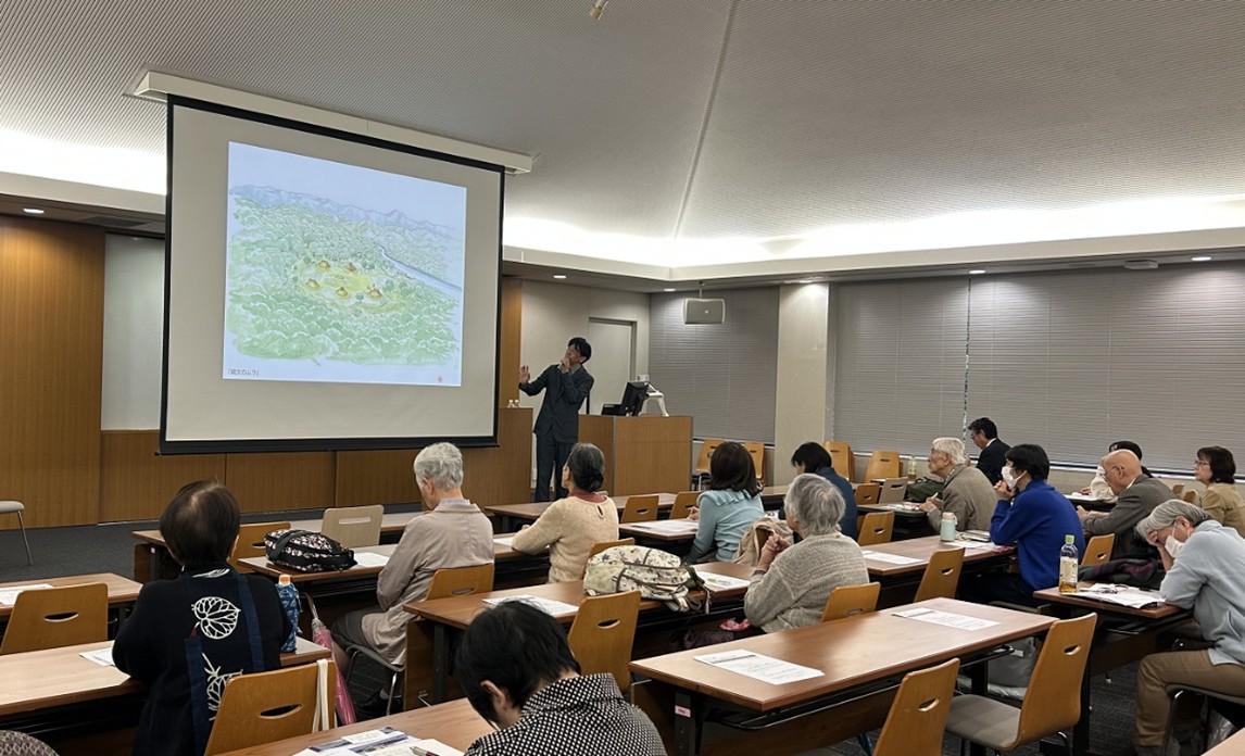 二部では、京都文化博物館学芸担当係長山崎頼人先生により、現在開催中の特別展「世界遺産 縄文」から遮光器土偶などたくさんの画像や動画を用いて、縄文文化についてご考察いただきました。